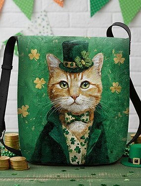 Sac bandoulière femme pour la Saint-Patrick, en velours polyester imprimé chat et trèfle, plusieurs modèles disponibles, idéal pour les fêtes et au quotidien.