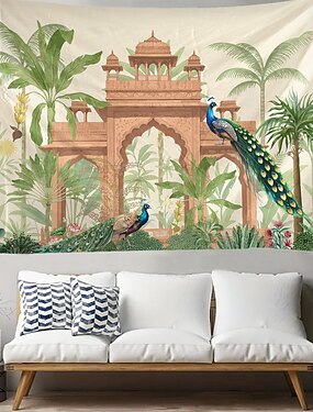 Tapisserie murale vintage indienne de style moghol, ornée de paons, de palmiers tropicaux et évoquant un palais, un pavillon ou un jardin. Idéale pour le salon, la chambre ou une chambre d'étudiant,