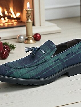 Mocassins à pampilles à carreaux verts et bleu marine pour hommes - un look décontracté de Noël élégant, parfait pour les fêtes de fin d'année et les occasions festives