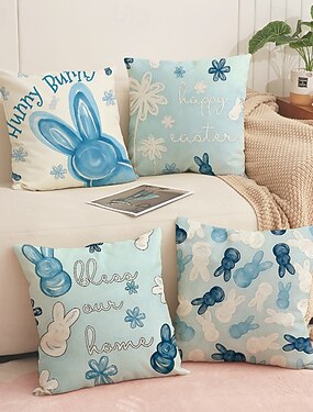 Ensemble de 4 housses de coussin respirantes en lin imprimé lapin de Pâques, pour canapé ou fauteuil. Décoration printanière pour la maison.