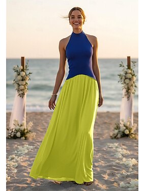 Ligne A Longueur au sol Robe d'invité de mariage Robe de Cérémonie Robe de soirée Robes pour invités de mariage Élégant Sans manches Col Halter Formel Chiffon Extensible Tissu Extensible avec Bloc de
