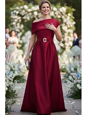 Ligne A Longueur au sol Robe en Satin Robe d'invité de mariage Robe de Cérémonie Robe de Mère de Mariée Manches Courtes Une Épaule Élégant ancien Formel Satin avec Ceinture / Ruban