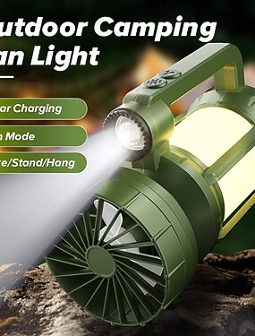 Lanterne portable rechargeable solaire USB-C avec ventilateur silencieux, conception suspendue, étanche IP44, lampe LED multifonctionnelle pour le camping, la maison et les activités de plein air.