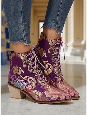 Bottines à lacets en jacquard violet pour femme avec broderie florale et talon bas - Bottes style bohème vintage des années 1920 pour dames, parfaites pour les festivals, les soirées Gatsby &mode
