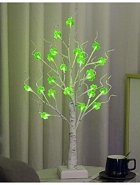 Décoration de table artificielle pré-illuminée pour la Saint-Patrick : sapins en bouleau illuminés par des LED, ornés de trèfles et de décorations en forme de trèfle. Centre de table sur le thème