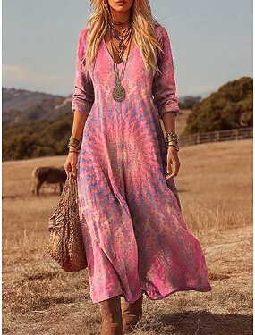Robe Maxi Femme Boho Robe T-Shirt Robe Tee Décontractée Quotidien Ample Imprimé Abstrait Manches Longues Col en V Bleu Rose Rouge Été Printemps
