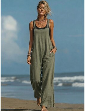 Salopette normale en lin ressemblant à du coton active couleur unie sans manches jambes larges col carré poche quotidienne vacances coupe ample rouge bleu marine kaki été