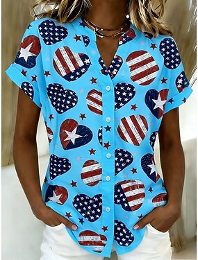 Jour de l'Indépendance Américaine Femmes Chemisier Boutons Imprimé Cœur Graphique Géométrique ancien Élégant Occasionnel Manche Courte Col en V Hauts Réguliers Quotidien Bleu Blanche Jaune Ét