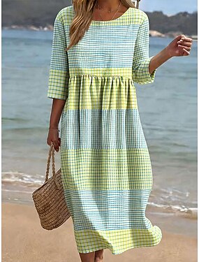 Femmes Robe Midi Robe d'Été Robe d'été Vacances Occasionnel Boho Plage Fête Coupe Ample Graphique Plaid Manche 3/4 Col ras du cou Bleu Jaune Orange Été Printemps