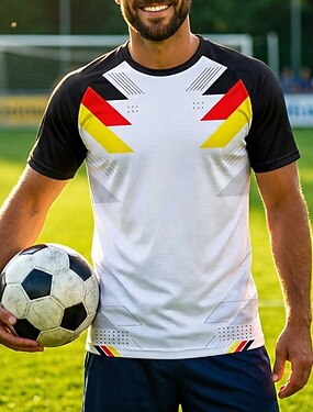 Maillot de football homme, col rond, manches courtes, mesh respirant, protection UPF50+, idéal pour les tournois, Allemagne, coloris noir, blanc, rouge et jaune, motif géométrique dégradé.