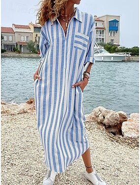Femmes Robe Midi Robe Décontractée Élégant Plage Coupe Ample Graphique Rayure manche longue Col de chemise Bleu Jaune Rose Claire Vert Été Printemps
