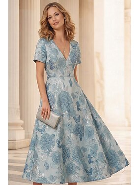 Ligne A Longueur cheville Longueur thé Robe de Cérémonie Robes de Cocktail Élégant Manche Courte Col en V Mariage Formel Jacquard avec Plis