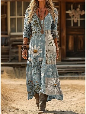 Femmes Robe maxi Robe bohème Robe Vintage Robe Décontractée ancien Quotidien Extérieur Vacances Coupe régulière Fleuri manche longue Col en V Bleu Jaune clair Vert Claire Violet Claire Printemps
