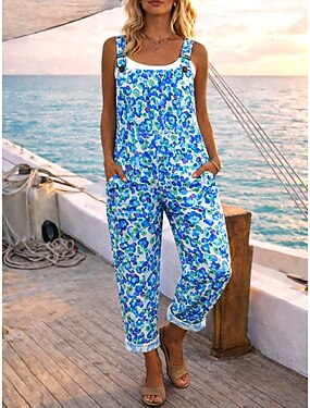 Femmes Combinaison Actif Fleuri Sans manches Sans manches Sarouel Col carré Avec Poches Imprimé Quotidien Vacances Coupe Ample Bleu Été
