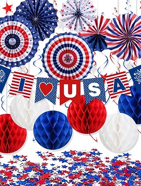 27 décorations rouges, blanches et bleues pour le 4 juillet aux États-Unis : éventails en papier, pompons et guirlandes suspendues pour une fête patriotique, célébrant l’indépendance, les vétérans,