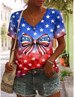 Jour de l'Indépendance Américaine Femmes T-shirt Imprimé Graphique Élégant Classique Occasionnel Manche Courte Col en V Hauts Réguliers Quotidien Sortir Week-end Bleu Noir Blanche Rouge Vert Ét