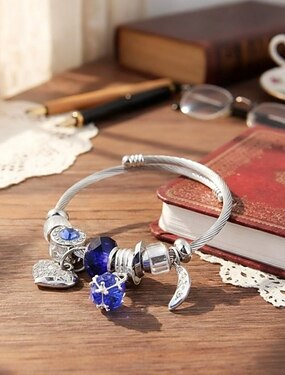 Bracelet jonc en argent orné de cristaux multicolores et de breloques en forme de cœur, de lune et de perles – bracelet personnalisable pour femme
