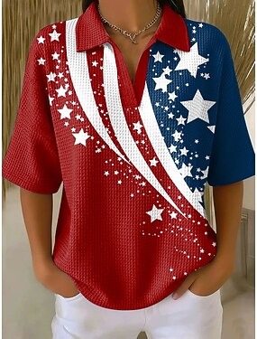 Jour de l'Indépendance Américaine Femmes Tee-shirt Gaufre Tops tricotés texturés Graphique Drapeau Américain Élégant ancien Classique Demi Manches Col Polo Hauts Réguliers Occasionnel Quotidien Bleu