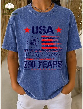 Jour de l'Indépendance Américaine Femmes 100% Coton T-shirt Hauts effet délavé vintage Imprimé Graphique Drapeau Élégant Basique Occasionnel Manche Courte Col ras du cou Hauts Réguliers Occasionnel