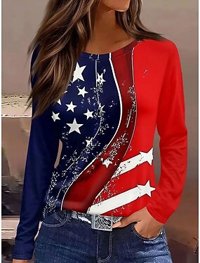 Jour de l'Indépendance Américaine Femmes T-shirt Imprimé Graphique Drapeau Etoile Mode Basique Classique manche longue Col ras du cou Hauts Réguliers Quotidien Sortir Week-end Bleu Rouge Ét