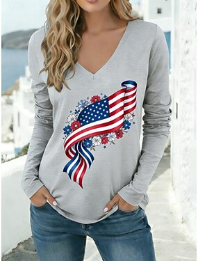 Jour de l'Indépendance Américaine Femmes T-shirt Imprimé Fleuri Drapeau Américain Élégant Classique Occasionnel manche longue Col en V Hauts Réguliers Quotidien Sortir Rouge bleu marine Kaki Gris