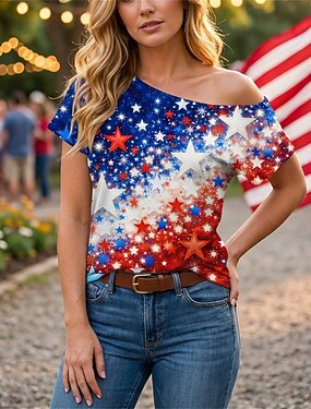 250e anniversaire des États-Unis Rétro Vintage Années 1980 T-shirt Une Epaule Manches courtes Déguisement Femmes 4 Juillet Jour de l'indépendance Adulte T-shirt