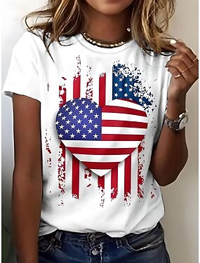 Jour de l'Indépendance Américaine Femmes T-shirt Imprimé Fleuri Graphique Élégant Classique Occasionnel Manche Courte Col ras du cou Hauts Réguliers Quotidien Sortir Week-end Bleu Noir Blanche Rouge
