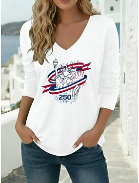 Jour de l'Indépendance Américaine Femmes T-shirt Imprimé Graphique Élégant Classique Occasionnel manche longue Col en V Hauts Réguliers Quotidien Bleu Noir Blanche Rouge Vert Printemps Automne