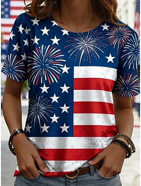 Jour de l'Indépendance Américaine Femmes T-shirt Imprimé Graphique Drapeau Élégant Classique Occasionnel Manche Courte Col ras du cou Hauts Réguliers Quotidien Sortir Week-end Bleu Bleu Roi Ét