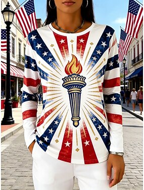 Jour de l'Indépendance Américaine Femmes T-shirt Imprimé Graphique Drapeau Américain Mode Classique Occasionnel manche longue Col ras du cou Hauts Réguliers Quotidien Sortir Week-end Bleu Blanche