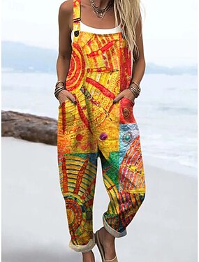 Femmes Combinaison Streetwear Graphique Sans manches Sans manches Col carré Avec Poches Imprimé Quotidien Vacances Coupe Ample Jaune Été