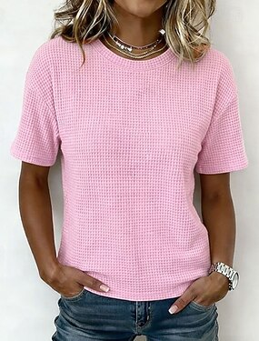 Femmes T-shirt Tops en tricot gaufre Couleur Unie Élégant Classique Moderne Manche Courte Col ras du cou Col rond Hauts Réguliers Occasionnel Quotidien Sortir Noir Blanche Jaune Rose Claire Vin Ét