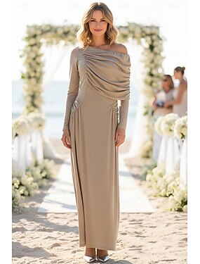 Ligne A Longueur thé Robes de Cocktail Robes de soirée Élégant manche longue Épaules Dénudées Fête de jardin Mariage Crêpe Extensible avec Noeud(s)