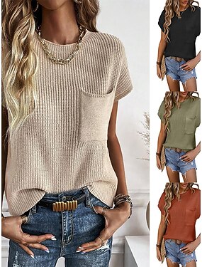 Femmes Pull Élégant Mode Streetwear Couleur Unie Col ras du cou Tricoté Manches courtes Hauts Réguliers Tricoter Quotidien Extérieur Week-end Marron Rouge Noir Été Printemps