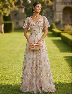 Ligne A Robe Longueur au sol Robe Maxi Robe de Soirée Robe de Cocktail Robe de Mère de Mariée Manche Courte Col en V Élégant ancien Luxueux Formel robe demoiselle d honneur Kentucky Derby Mélange de