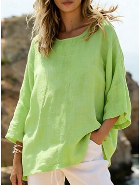 Femmes Chemise Chemises en coton et lin Chemisier Uni Élégant Classique Moderne manche longue Col ras du cou Hauts Réguliers Quotidien Fête Sortir Bleu Vert herbe Noir Blanche Rose Claire Printemps
