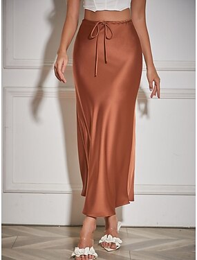 Femmes Jupes en satin Élégant Mode Maxi Taille haute Jupes Uni Cordon de serrage Micro-Élastique Soirée Date Noir bleu marine Marron clair Marron Été Satin Polyester