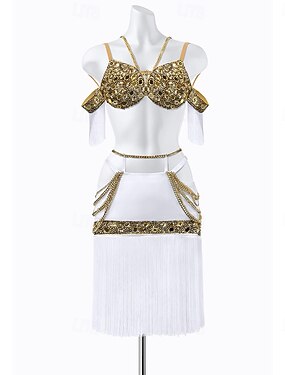 Ensemble de danse latine pour femme, or et blanc pailleté - soutien-gorge orné de perles, jupe à franges avec détails de chaînes, manches épaules dénudées.
