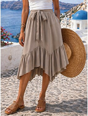 Femmes Jupe de vacances Mode Occasionnel Midi Taille haute Jupes Uni Froncé A Volants Micro-Élastique Quotidien Vacances Kaki Été
