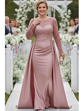 Sirène Trompette Longueur au sol Robes à paillettes Robe d'invité de mariage Robe de Cérémonie Robe de Mère de Mariée manche longue Col Illusion Élégant Éclat & Brillance Satin Pailleté avec Perles