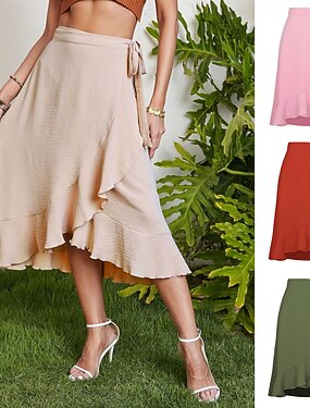 Femmes Jupe de vacances Mode Occasionnel Midi Taille haute Jupes Uni A Volants Micro-Élastique Quotidien Rue Noir Rose Claire Vert Véronèse Rouge Été