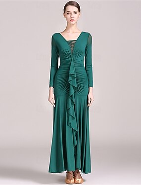Robe de danse de salon verte à manches longues, détails froncés et jupe à volants pour une danse latine élégante &spectacle de salle de bal