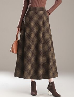 Femmes Élégant Rétro Vintage Maxi Taille haute Jupes Plaid Bloc de Couleur Avec Poches Longue Micro-Élastique Quotidien Décontracté Quotidien Rouge Kaki Automne