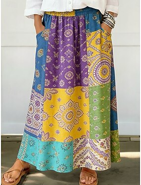 Femmes Jupe de vacances Bohème ancien Mode Occasionnel Maxi Taille Basse Jupes Paisley Patchwork Imprimé Micro-Élastique Quotidien Rue Violet Été