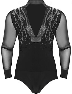 Justaucorps noir pour homme, style danse de salon latine - justaucorps en maille transparente orné de strass et décolleté en V profond, idéal pour la compétition