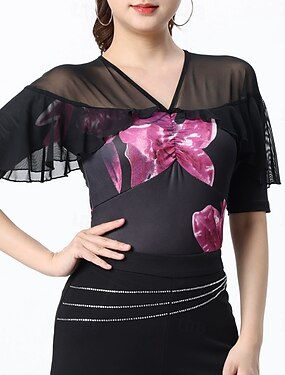 Danse Latine Haut Impression Épissage Tulle Femmes Performance Entraînement Demi Manches Haut Polyester