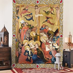 Tenture médiévale tapisserie du Moyen Âge art religieux grande tenture murale décorative toile de fond de photographie pour décoration de maison chambre salon La Crucifixion par le Maître du Haut-Rhin