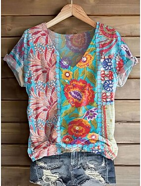 Femmes T-shirt Imprimé Fleuri Graphique Plantes ancien Élégant Occasionnel Manche Courte Col en V Hauts Réguliers Quotidien Week-end Bleu Bleu / Violet Blanche Jaune Rose Claire Été Printemps