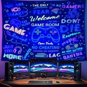 Tapisserie murale fluorescente pour salle de jeux, avec des mots néon éclatants et un motif de manette de jeu, idéale pour décorer les murs d'une chambre, d'un salon ou d'une salle de jeux.