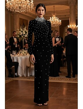 Robe Silhouette Colonne Traîne Brossée Robes Formelles Robe de Soirée Robe de Bal Élégante Vintage Manches Longues Col Ras du Cou Formelle avec Cristaux Perles